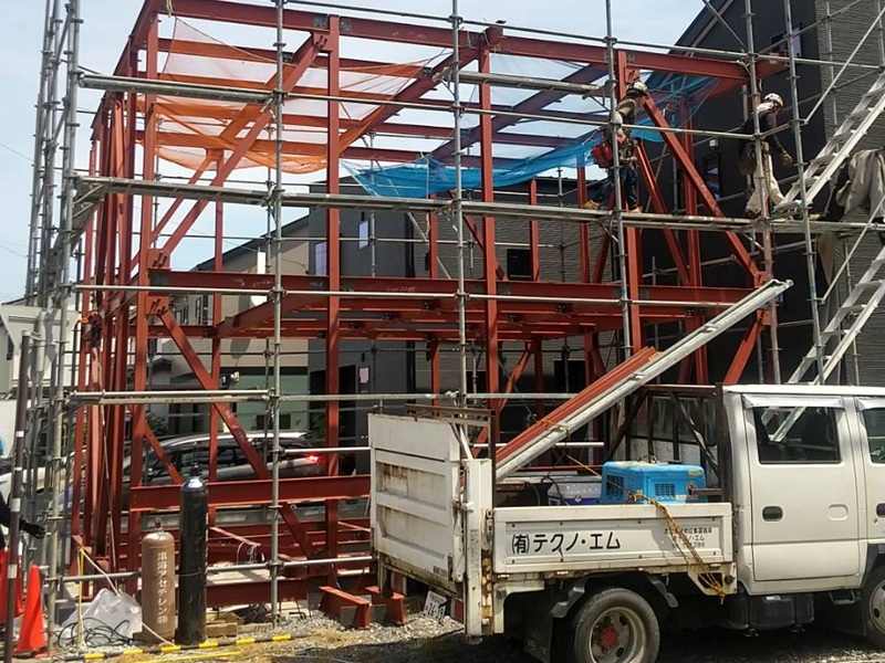 テクノエムでは、鉄骨工事において資材製作から施工図の作成、加工、現場施工まで一貫して行うことができます。